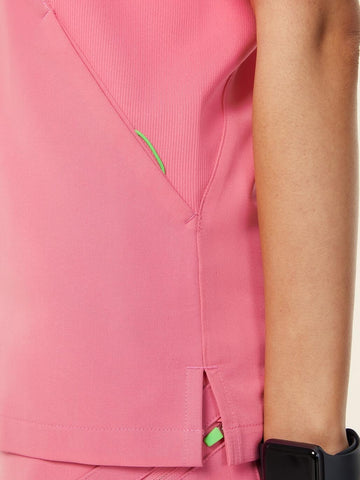The Charles Scrub Top combines a slim fit with sleek, functional design. Featuring a V-neck opening and a center front zip, it offers ease of wear and a customizable fit. With short sleeves and a mid-length cut, this top provides both comfort and style. Two hip pockets offer practical storage, while contrast key loops at the shoulder and one pocket add a stylish touch. Side splits enhance movement, and the high-stretch rib fabric side panels ensure extra stretch and comfort for all-day wear.