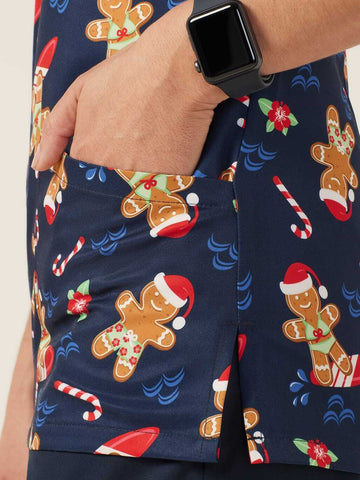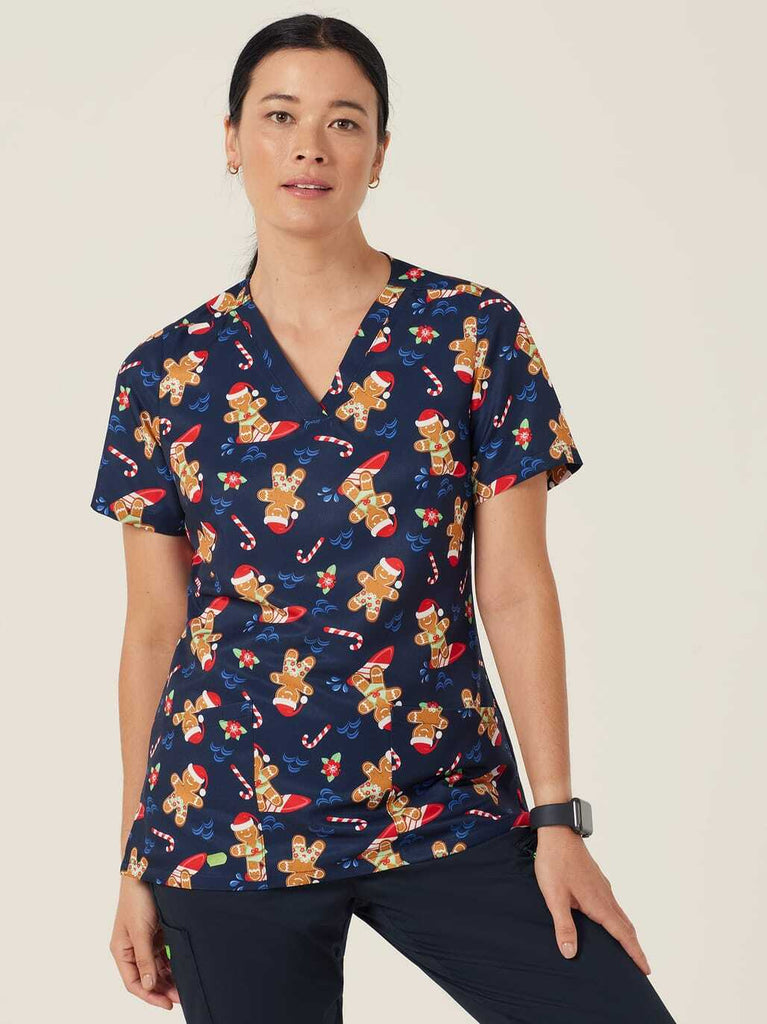 Make them smile this festive season in our Xmas Gingerbread Surfer Print Scrub Top. The popular style features a comfortable and flattering womenswear fit with a handy V-neck, making it easy to slip on and go. For a limited time, the top comes splashed in this cheerful, limited-edition print starring cute gingerbread characters ready for a day at the beach. Complete with candy canes and hibiscus flowers on a hot pink or midnight blue background, the design is guaranteed to brighten the day.