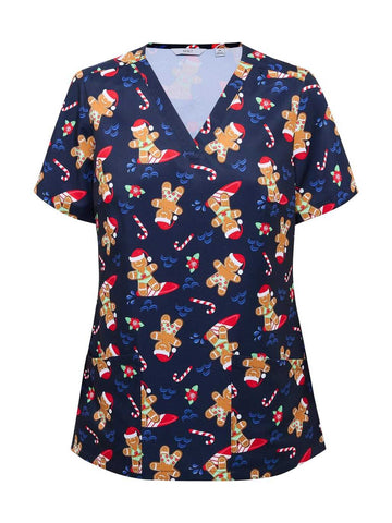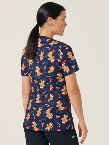 WOMENS XMAS Gingerbread Surfer Print Scrub Top (CATUXV) - Navy